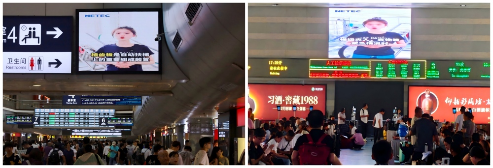 北京西站作為亞洲規(guī)模領(lǐng)先、客流量密集的現(xiàn)代化鐵路樞紐,每日承擔(dān)數(shù)十萬旅客的出行服務(wù)。車站方深知提升旅客安全乘梯意識的重要性,在自媒體平臺看到上述科普視頻后,主動聯(lián)系NETEC并提出轉(zhuǎn)播申請。經(jīng)友好溝通,NETEC 同意北京西站在其候車大廳核心區(qū)域的電子顯示屏上,全天候高頻次滾動播放該視頻。